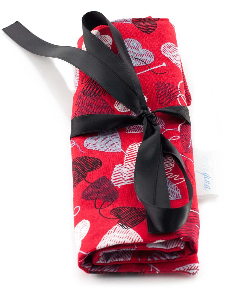Crochet hook case (heart of wool patterns) with 12 compartments for storing your crochets. The cases with colorful patterns have a large and beautiful ribbon to close the case. Your crochets will follow you in a convenient and fashionable way. It is designed to hold 12 crochets of 6″.