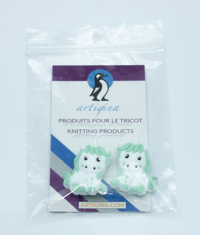 Protecteurs de pointe souples Artigina pour les extrémités des aiguilles à tricoter. En plus de protéger les pointes, les protecteurs permettent aux mailles de rester en place même dans votre sac de rangement. L’ensemble comprend 2 protecteurs en forme de petite licorne. Les protecteurs de pointes conviennent aux embouts de 2,5 mm à 10 mm.