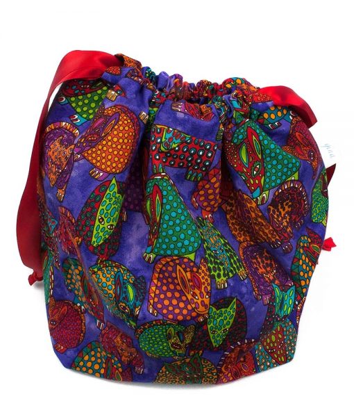 Sac à tricot avec pochette de rangement aux motifs extérieurs de tatous et intérieur orange uni. Pour tous ceux et celles qui sont toujours en mouvement.